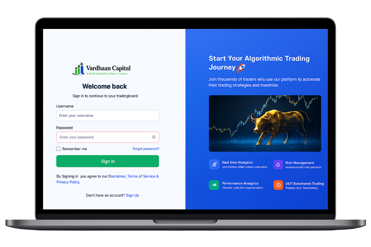 Vardhaan Capital’s Algo Trading Platform makes trading simple, smart, and stress-free. Select from proven strategies, connect your broker, and let automation handle the rest.